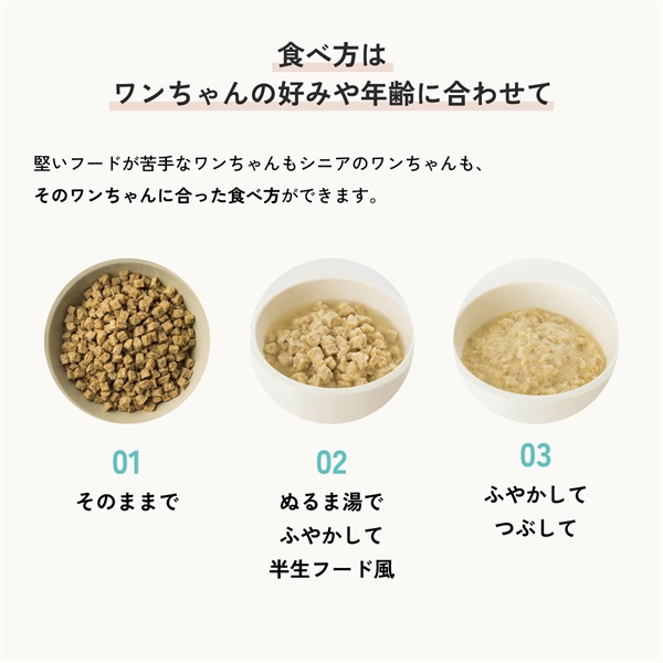 「最近ごはんを食べなくなってきた」そんなワンちゃんにも取り入れやすいドッグフード工房。天然食材由来の旨味や香りに配慮し、ぬるま湯でやわらかくなる設計です。