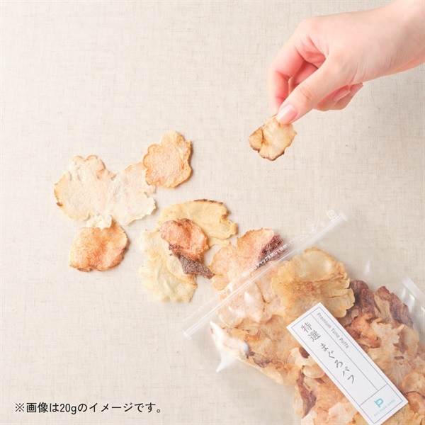 枕崎・焼津のまぐろをそのまま使用して、簡単に手でちぎれる軽い食感のパフに仕上げた無添加おやつ