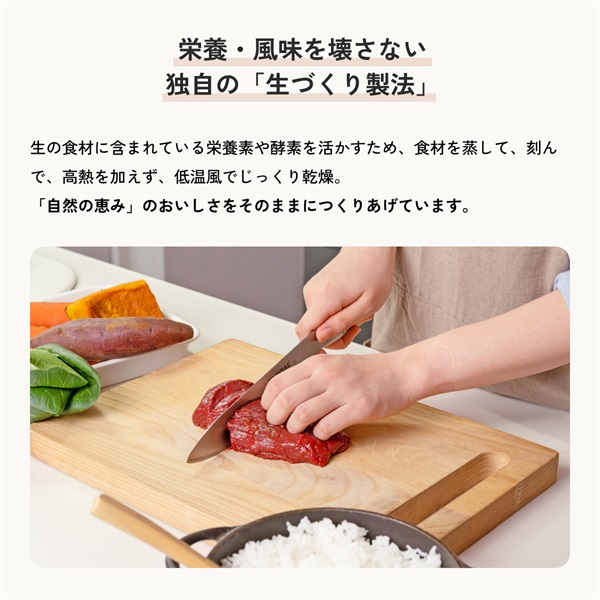 生の食材に含まれている栄養素や酵素を活かすため、食材を蒸して、刻んで、高熱を加えず、低温風でじっくり乾燥。