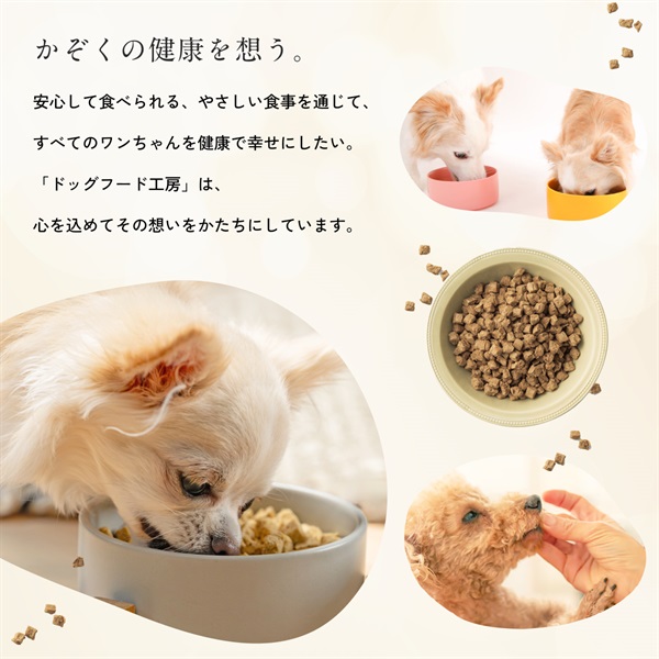 「最近ごはんを食べなくなってきた」そんなワンちゃんにも取り入れやすいドッグフード工房。天然食材由来の旨味や香りに配慮し、ぬるま湯でやわらかくなる設計です。