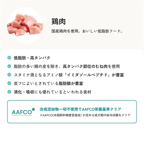 国産鶏肉を使用。おいしい低脂肪フード。