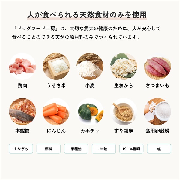鶏肉・うるち米・小麦・生おから・さつまいも・本鰹節・にんじん・カボチャ・すり胡麻・食用卵殻粉・すなぎも・鰯粉・菜種油・米油・ビール酵母・塩