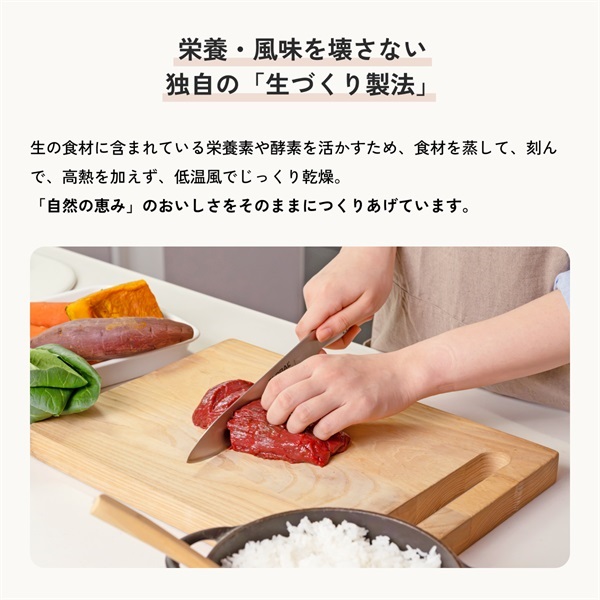 生の食材に含まれている栄養素や酵素を活かすため、食材を蒸して、刻んで、高熱を加えず、低温風でじっくり乾燥。 「自然の恵み」のおいしさをそのままにつくりあげています。
