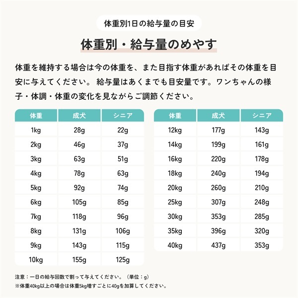 食事の量は環境や運動量によって異なります。上記の給与量を目安に、愛犬の体調に応じてフードの量を調整してください。