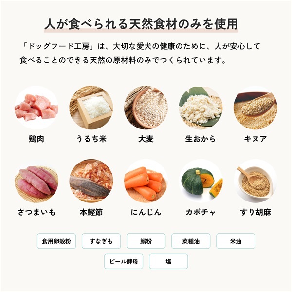 鶏肉・うるち米・大麦・生おから・キヌア・さつまいも・本鰹節・にんじん・カボチャ・すり胡麻・食用卵殻粉・すなぎも・鰯粉・菜種油・米油・ビール酵母・塩