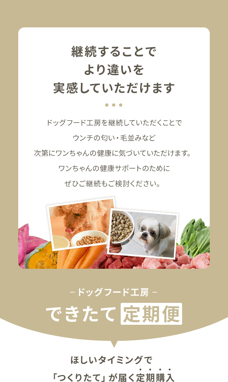 食材から得られる豊富なビタミンで、カラダの内側からワンちゃんの毛並みをサポート。継続してドッグフード工房を食べてもらうことで、ワンちゃんを撫でた時だけでなく、見た目から違いを感じていただけます。