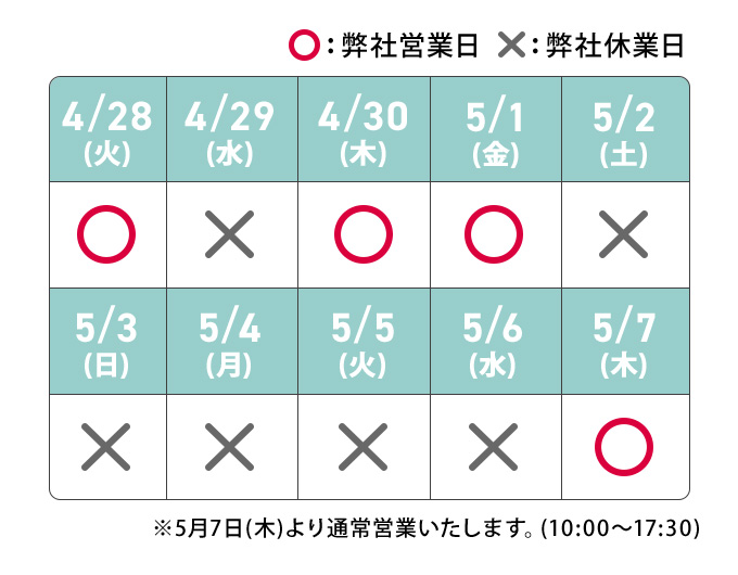 お客様窓口は4月29日(水)、5月2日(土)~ 5月6日(水)の間、誠に勝手ながらお休みとさせて頂きます。